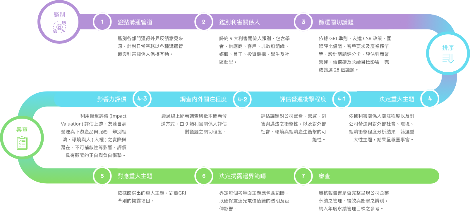 | 供應鏈管理 | 供應商為公司重要的合作夥伴,必須建立風控與獎懲機制,具備相同理念與倡議,方有助於永續發展 | 直接 | GRI 204 GRI 308 GRI 414 |