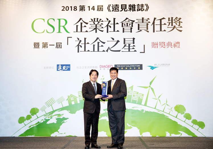 Maxman | 万博光電獲 2018 遠見 CSR 三項大獎,為獲獎最多企業,行政院長賴清德頒獎 (左),Maxman | 万博光電董事長暨執行長彭双浪受獎(右)
